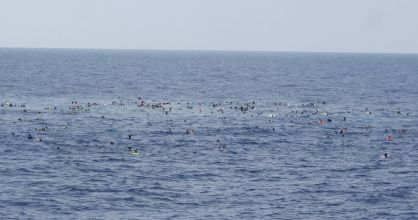 Decenas de personas esperan su rescate tras el naufragio de un barco que partió de Libia el miércoles, en una imagen facilitada por la policía italiana. / REUTERS